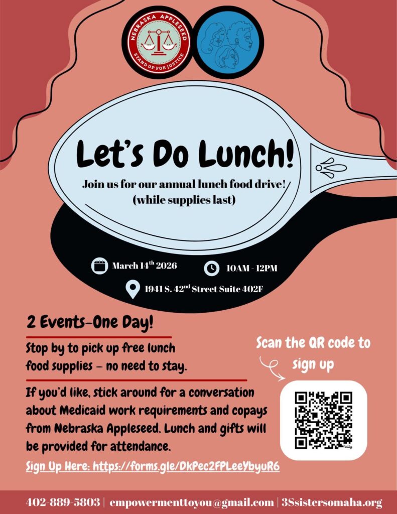 You’re invited to join Nebraska Appleseed at 3Sisters in Omaha on Saturday, March 14. Stop by anytime between 10:00 AM – 12:00 PM to learn about the Medicaid work requirements coming to Nebraska in May.